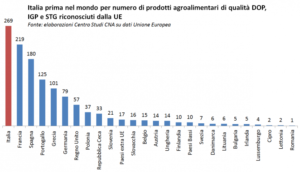 L’Italia è infatti il primo Paese al mondo per numero di prodotti agroalimentari di qualità. Con 269 riconoscimenti Dop (Denominazione di origine controllata), Igp (Indicazione geografica protetta) e Stg (Specialità tradizionali garantite) conferiti dall’Unione Europea, il nostro Paese occupa il gradino più alto in un podio nel quale al secondo posto figura la Francia (219 riconoscimenti) e al terzo la Spagna (180 riconoscimenti).
