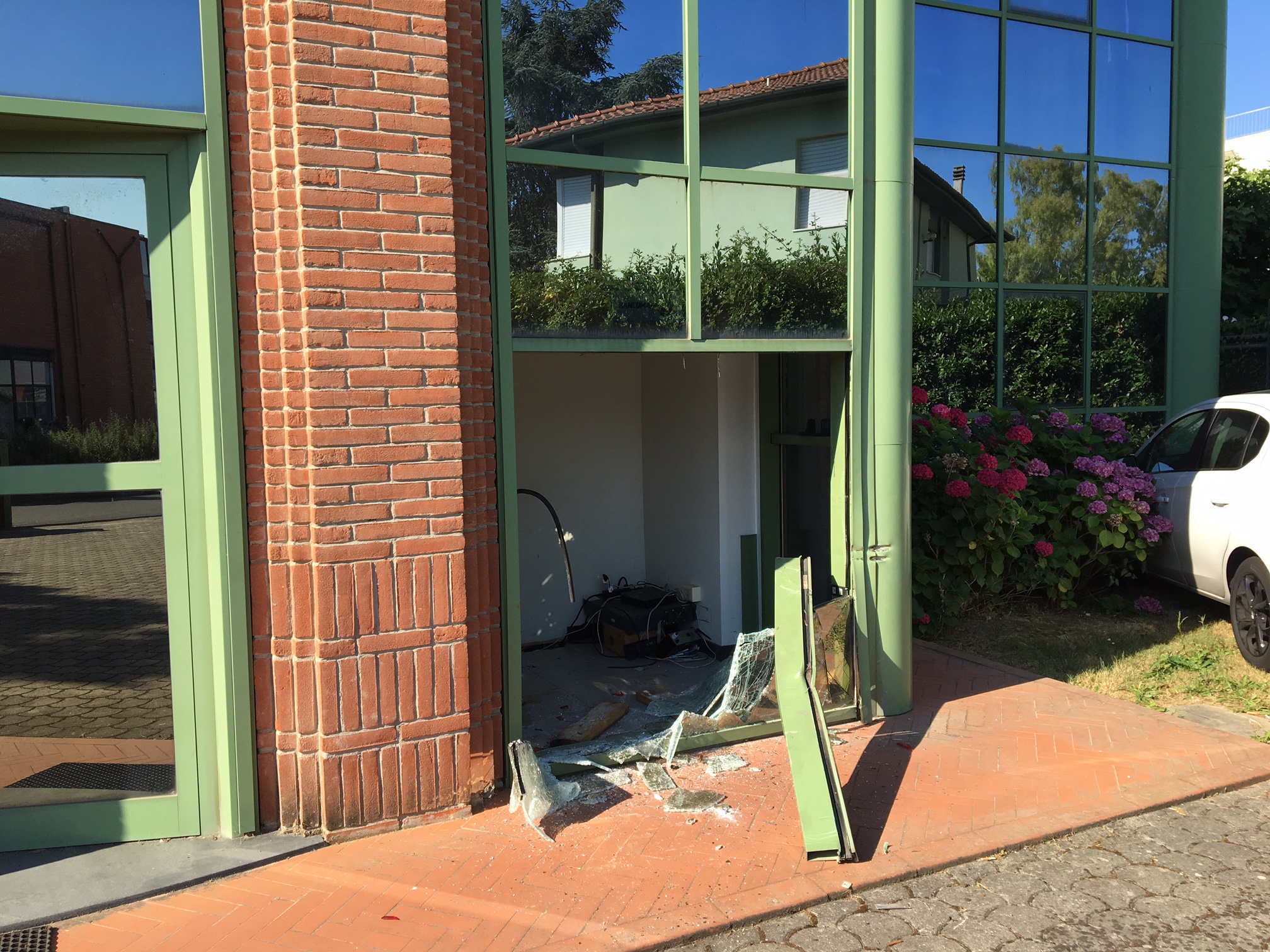Furto sventato alla sede CNA a La Fontina (S. Giuliano Terme) la notte tra il 20 e il 21 giugno, fra le 3 e le 4. Danni piuttosto seri alla vetrata ed alle strutture del piccolo locale in angolo al piano terra della sede CNA che ospita il servizio Bancomat di proprietà del Monte dei Paschi di Siena ed anche ad un vettura parcheggiata nel cortile.