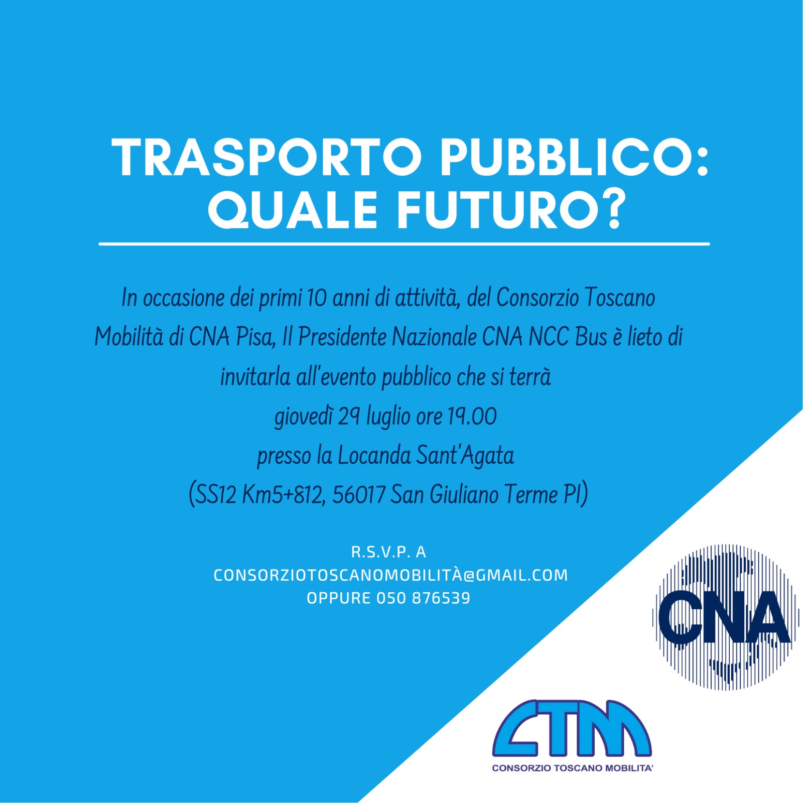 La ricorrenza – in occasione dei primi 10 anni di attività del Consorzio Toscano Mobilità di CNA Pisa – vedrà la partecipazione, oltre che del Presidente Nazionale CNA NCC Bus, anche di autorità e istituzioni cittadine e provinciali.